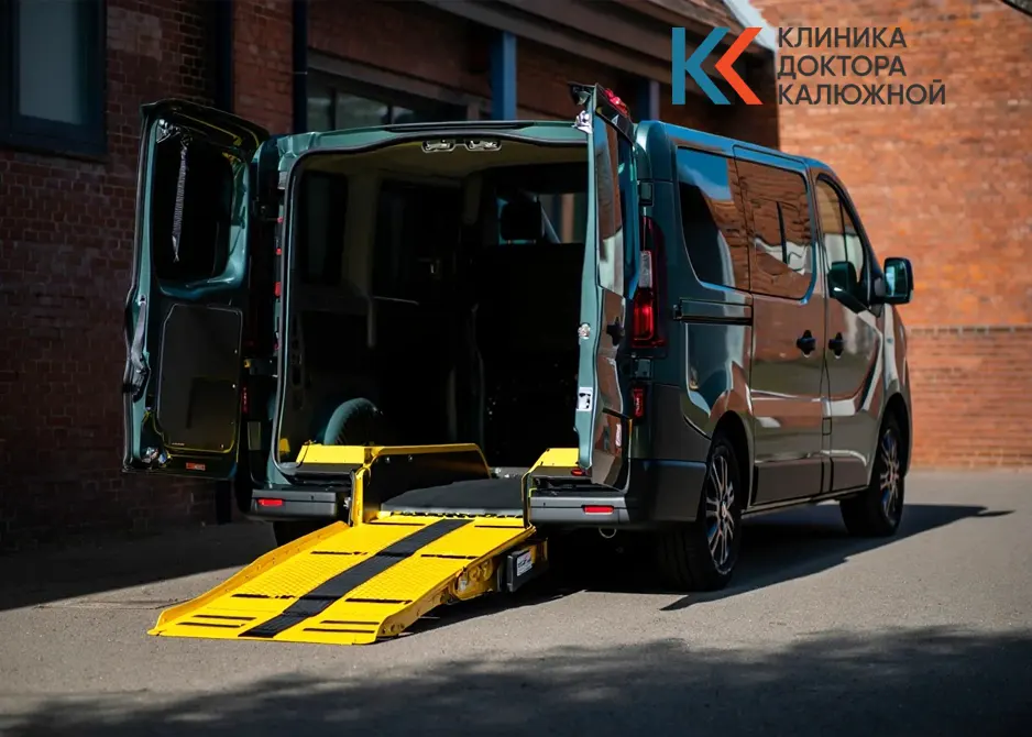 Безопасность и комфорт — приоритеты при транспортировке людей с ограниченной подвижностью. Врачи клиники доктора Калюжной используют для перевозки инвалидов-колясочников газель «Некст», «Соболь», минивэны и микроавтобусы. Эти автомобили специально модифицированы, обладают достаточной вместимостью и оснащены оборудованием.